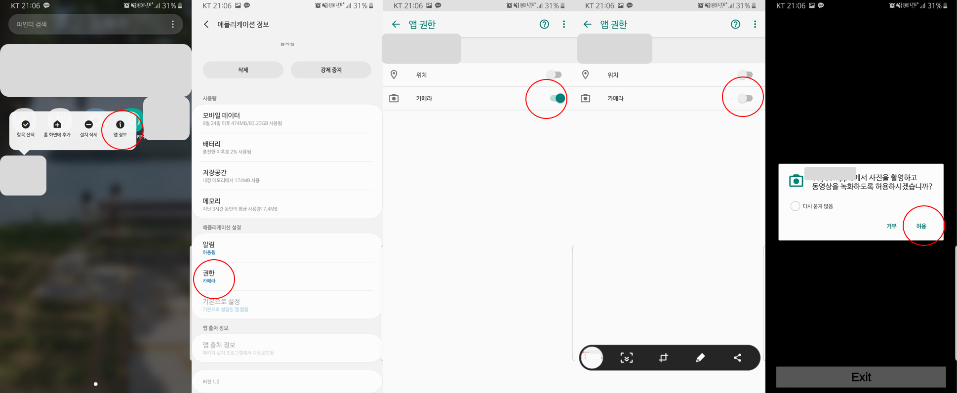 > App 정보 → 권한 → 카메라 → 해제 → Unity 실행 → 카메라 권한 부여