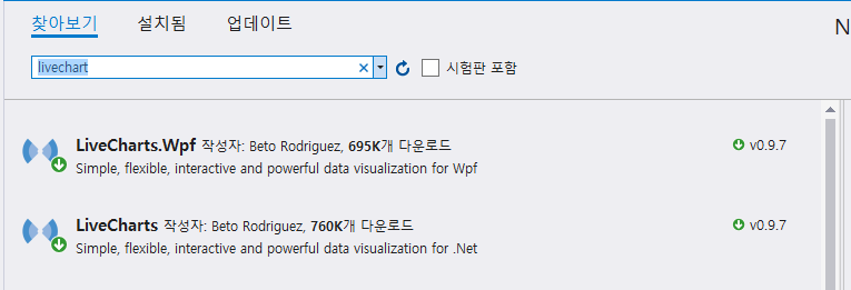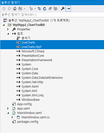 - LiveCharts.Wpf 를 설치 하면 LiveCharts 도 같이 설치 된다.