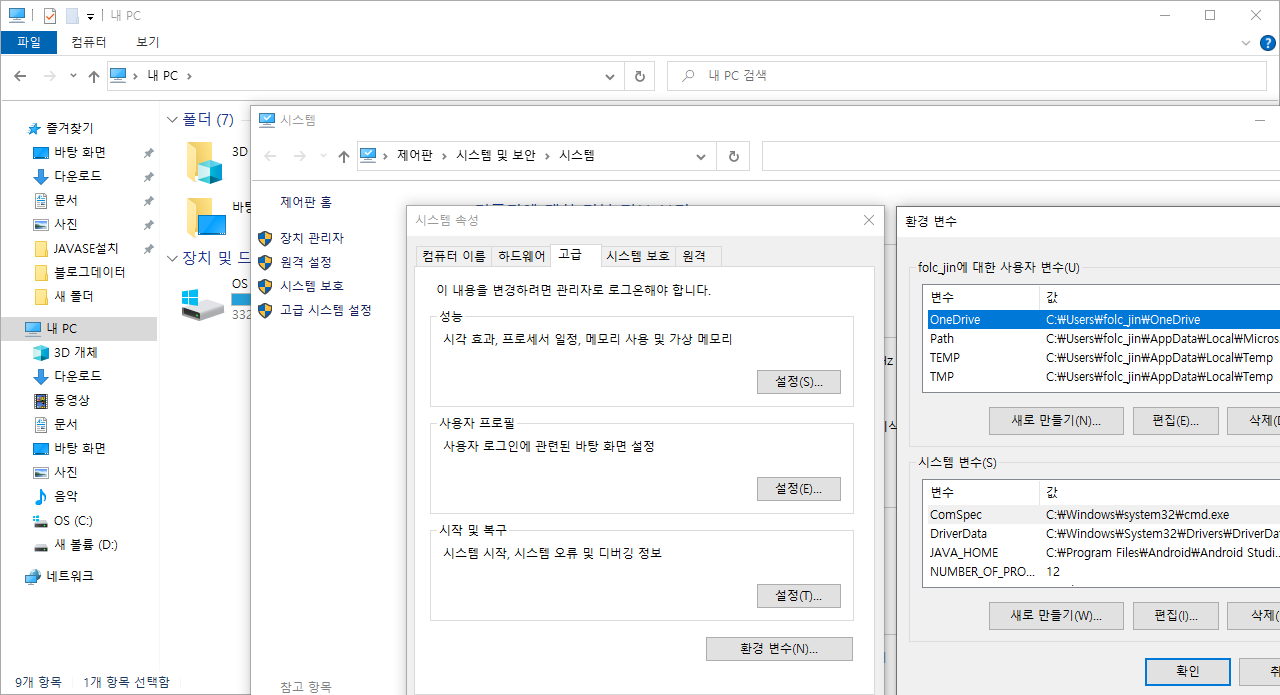 # 내컴퓨터 - 내 PC ( 마우스 R 버튼) - 속성 - 원격 설정 - 고급 - 환경 변수