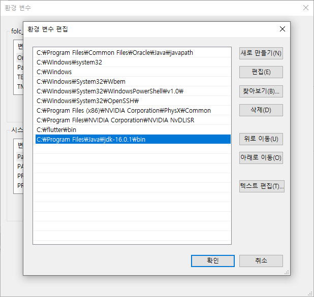 # 시스템 변수 - 변수(Path) - 편집 - 새로 만들기 - JDK 설치 경로 추가