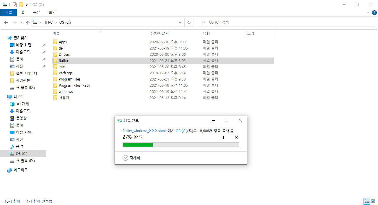 # 파일을 unzip 해서 flutter-windows-2.2.2-stable 안에 flutter 폴더 전체를 원하는 위치로 이동