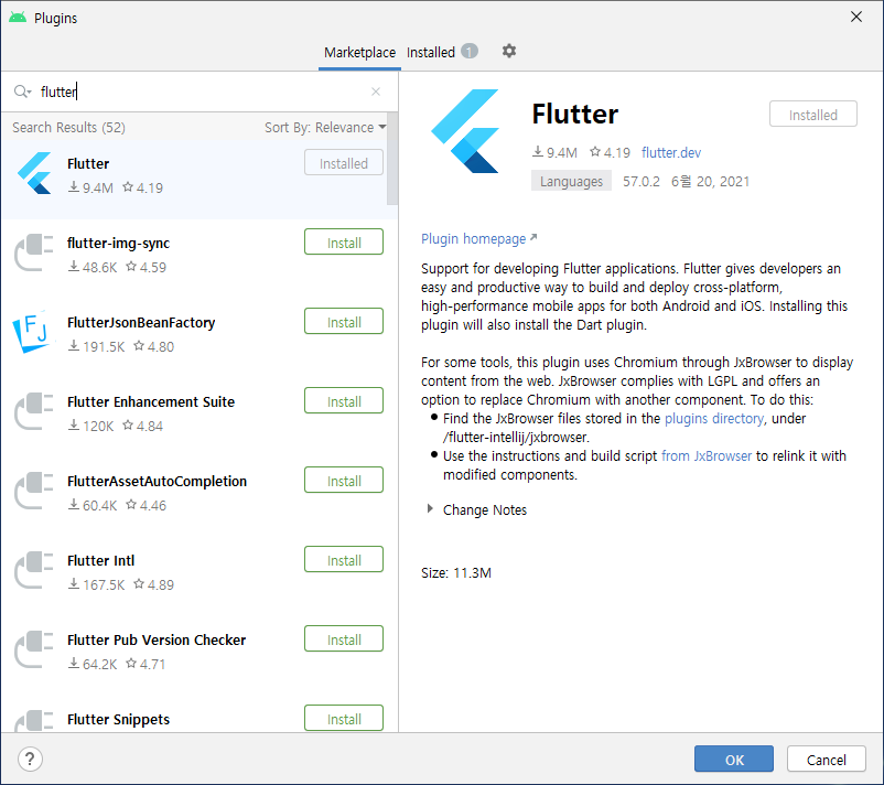 2. Android Studio Plugins - Flutter 설치