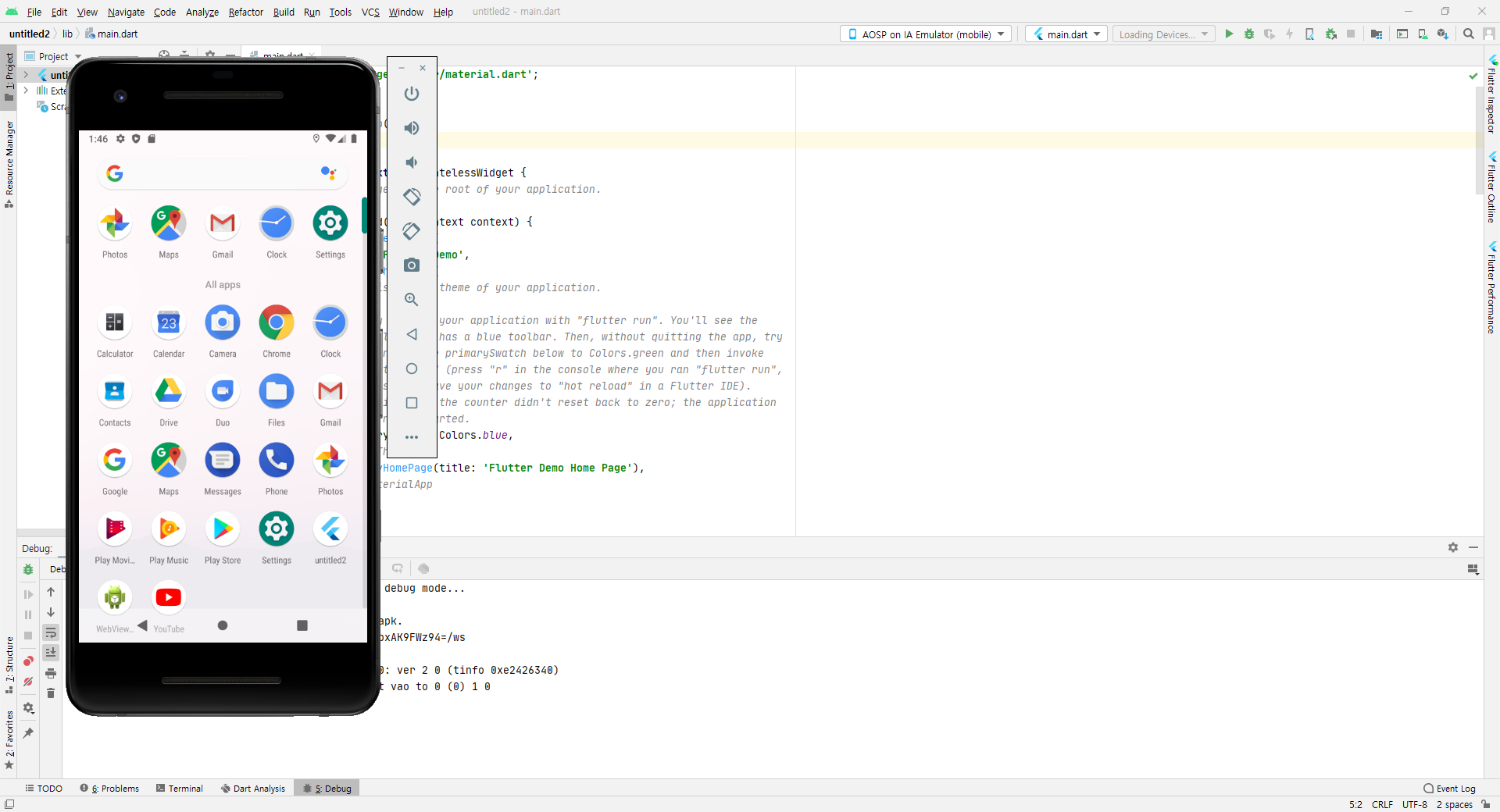 # 디버깅을 종료하면 Virtual Device 오른쪽 하단에 프로젝트 이름으로 설정한 (untitled2) 아이콘이 보인다.