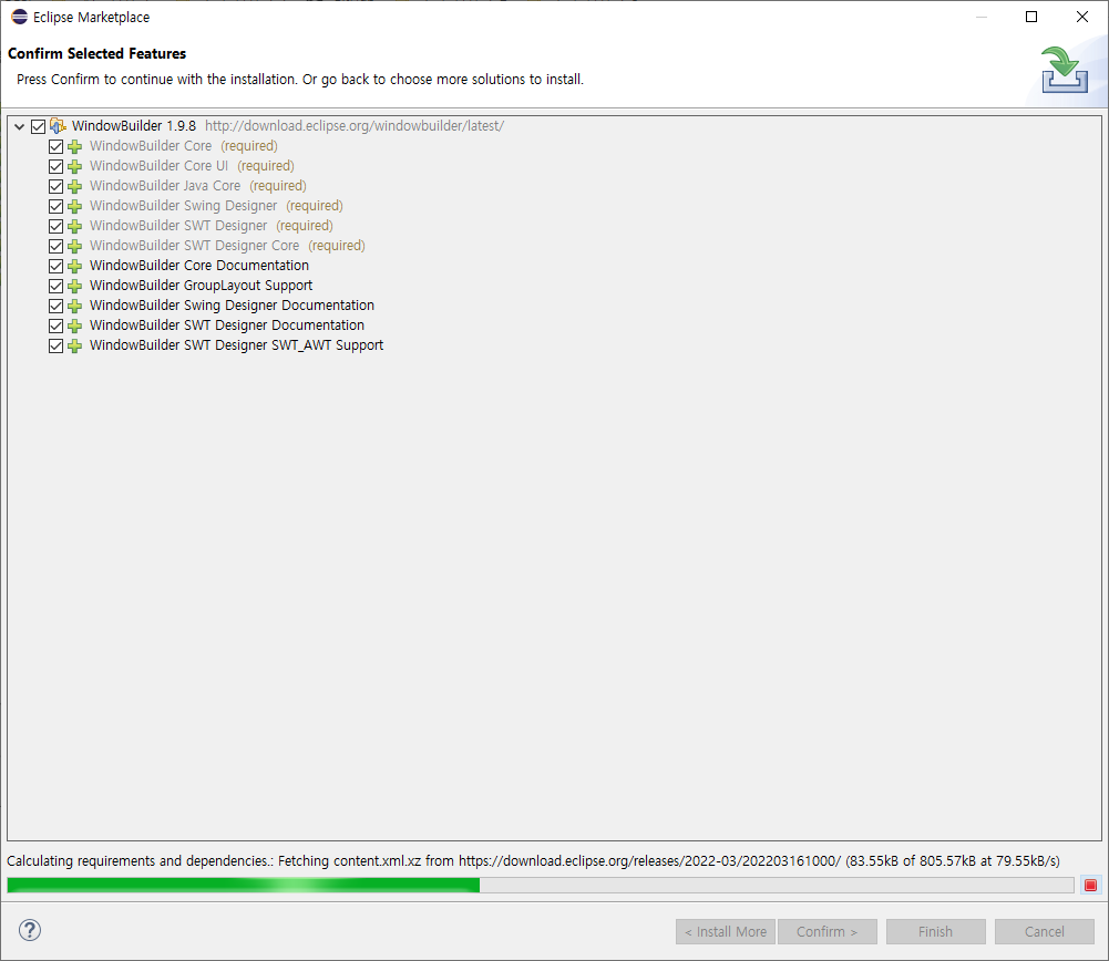 > WindowBuilder 1.9.8 ( SWT Designer and Swing Designer ... ) 선택 하여 Install
