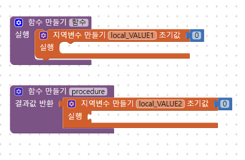 > "변수 - 지역변수 만들기" 화면에 Drag & Drop ( 초기값은 0으로 자동 설정되지만 되도록이면 값을 할당 하도록 한다. )