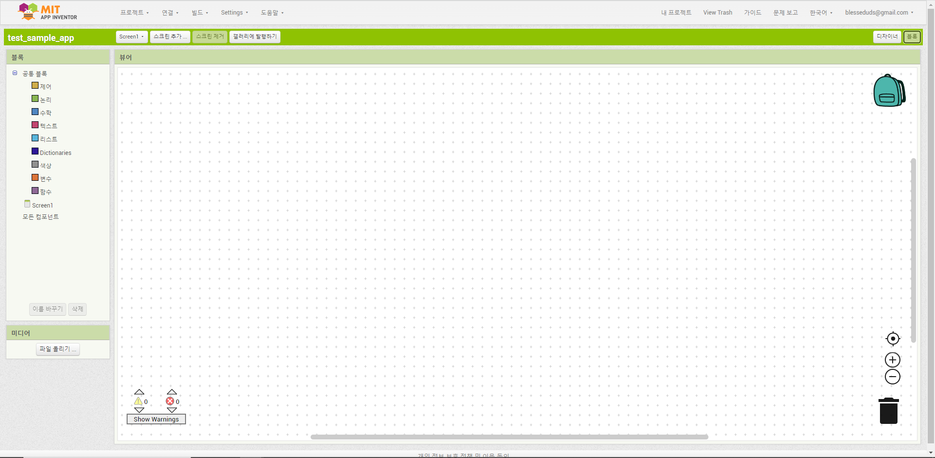 > 화면 우측에 "블록" 버튼을 누르면 선택되어 있는 화면(Screen1)에 대해서 기능을 작성한다.