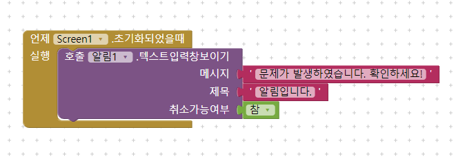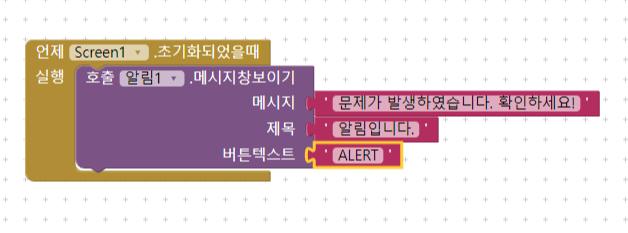 > 블록 화면으로 전환하고 "알림1" 클릭하여 EVENT 를 연결한다.
