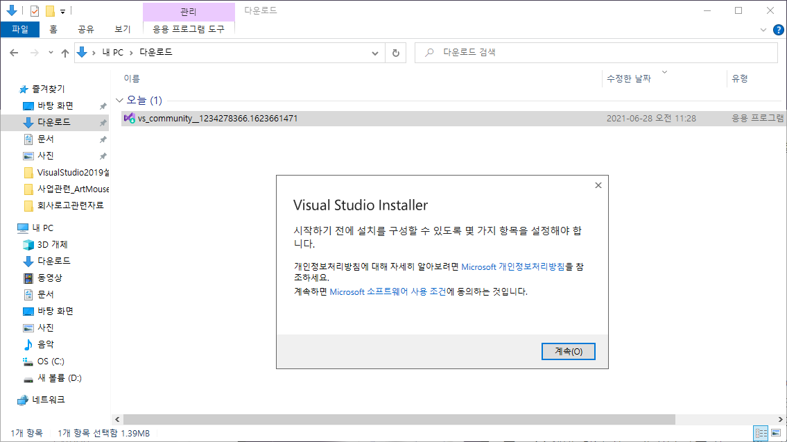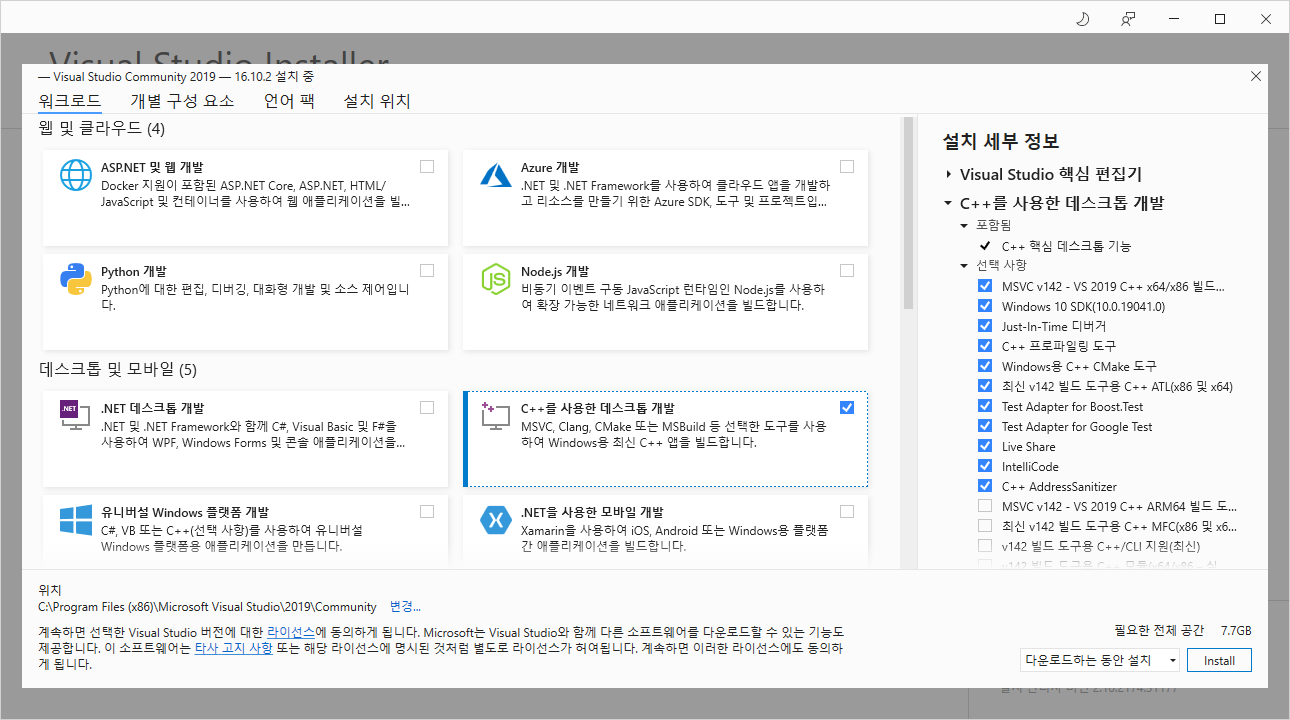 4. Visual Studio Installer 를 설치하고 개발 환경을 선택한다.