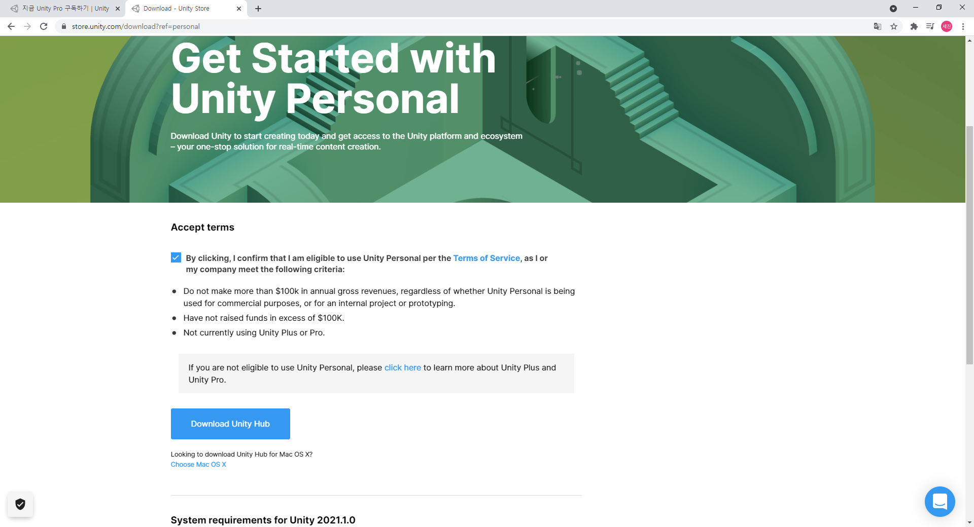 # Unity Login 을 수행하고 나서 Personal 선택 후 상업용인지? 교육용인지? 선택