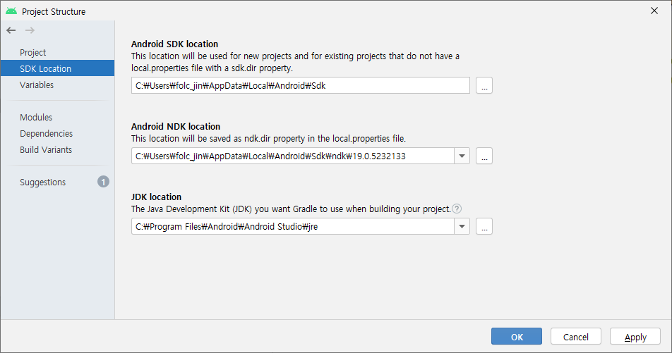 # File -> Open -> Solution -> android project -> New Window -> Project Structure -> SDK Location -> Android NDK location -> 위치 설정 후 Apply and OK -> Close Window