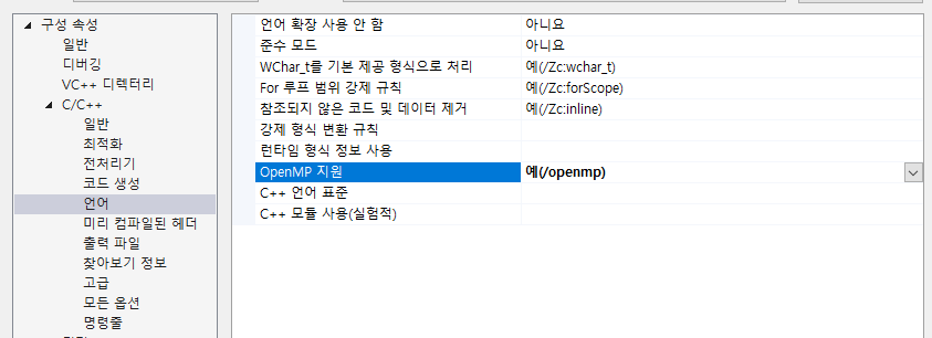 > 프로젝트 속성에서 OpenMP 지원을 설정하고 #include <omp.h> 를 추가하면 사용 가능